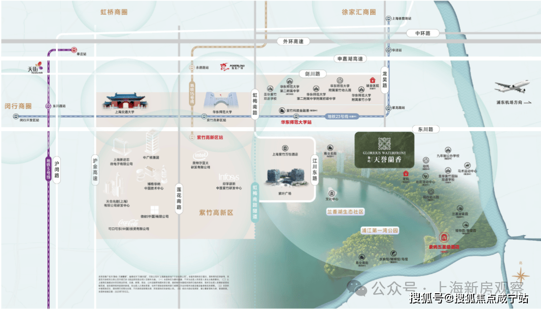 商业方面:兰香湖将是高新区生态、人文、科技理念的集中体现,未来将在近4公里的岸线上将会串联起商业北街、星月步道、文化艺术长廊、赛艇俱乐部、商业南街、活力公园、艺术地形公园、青少年活动中心等;周边还有吴泾宝龙广场、紫叶广场。